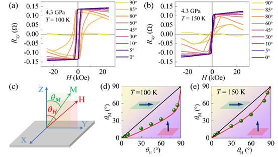 实例1. (Fe, Co)3GaTe2常压下基态为反铁磁,并在约在4.3 GPa下发生由反铁磁到铁磁的相变。然而,该体系在高压诱导铁磁基态下的磁晶各向异性类型及各向异性常数Ku仍缺乏明确实验证据。我们借助该装置进行了不同磁场取向下的反常霍尔效应测量(如图3所示),并采用 Stoner–Wohlfarth单畴模型对实验结果进行分析,确定其高压铁磁相表现为垂直各向异性。进一步拟合估算100 K和150 K时的单轴各向异性常数,分别为4.95×10⁵ J/m³和2.92×10⁵ J/m³。