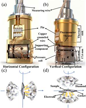 此外,为了满足不同磁场取向下的角度依赖测量需求,我们将DAC压机设计的更加紧凑,可装入29 mm的样品腔中;同时设计了多种连接与固定组件,使DAC压机既可实现水平放置,也可实现竖直放置(如图2(a, b)所示)。由此,可在保持原位高压条件的同时,实现磁场在面内-面外方向和面内-面内方向的磁输运测量(如图2(c, d)所示),为解析材料各向异性行为提供了更完整的实验自由度。