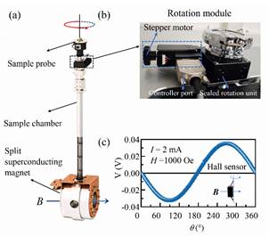 采用横向劈裂式磁体提供横向磁场,如图1所示。将旋转模块置于样品室顶部,可免于低温环境下转动而引起的机械误差。利用步进电机驱动实现大于360°的连续旋转,同时在旋转过程中能够保证良好的气密性,不会引起漏气现象。图1c为磁场固定情况下,利用标准霍尔器件测量的霍尔电压随磁场角度的变化,显示其高转角精度。