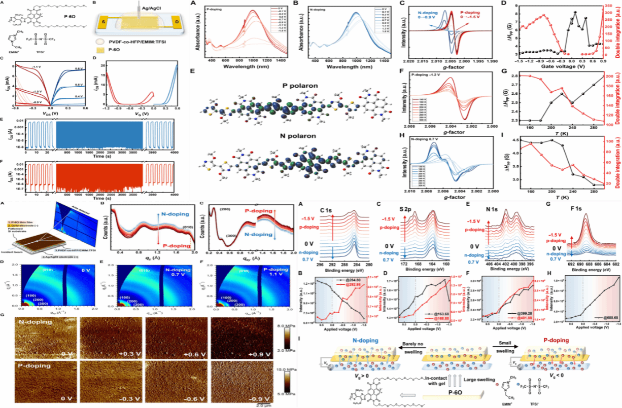 研究结合器件测试、原位光谱、电化学 EPR、GIWAXS、XPS 和力学测试,表征了 P-60 薄膜在不同栅压下的 p 型和 n 型电化学掺杂过程